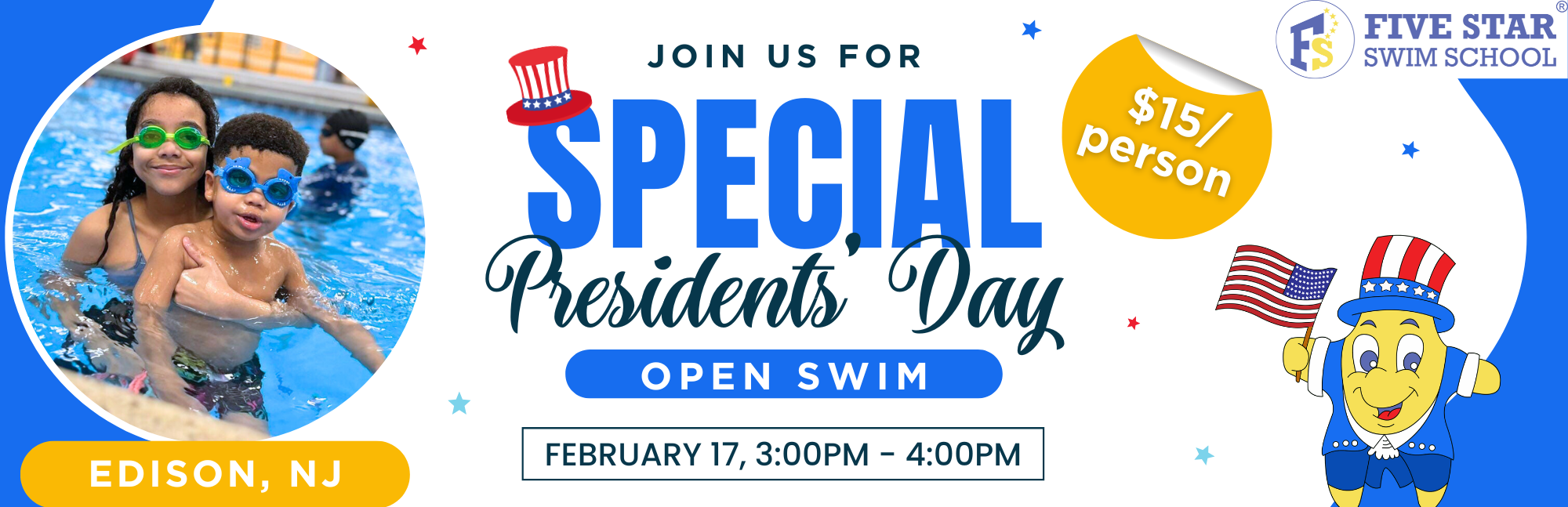 Celebrate Presidents' Day with a splash at Five Star Swim School - Edison! Join us on Monday, February 17th, from 3:00pm to 4:00pm for a Special Presidents' Day Open Swim event.