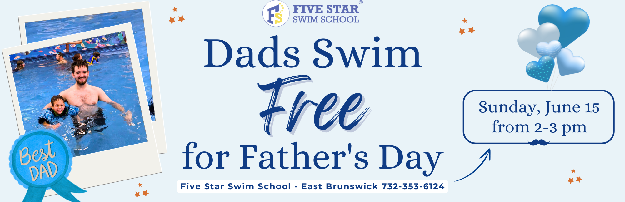 Join us on Sunday, June 15, from 2:00–3:00 PM at Five Star Swim School – East Brunswick for a special event where Dads swim FREE!*