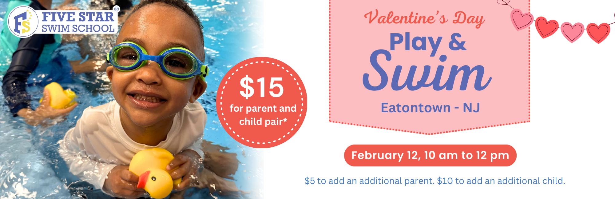 Join us on Thursday, February 12th from 10:00 AM to 12:00 PM, for our special Valentine’s Day Play&Swim. Enjoy free Valentine’s crafts and snacks, homeschool groups welcome!