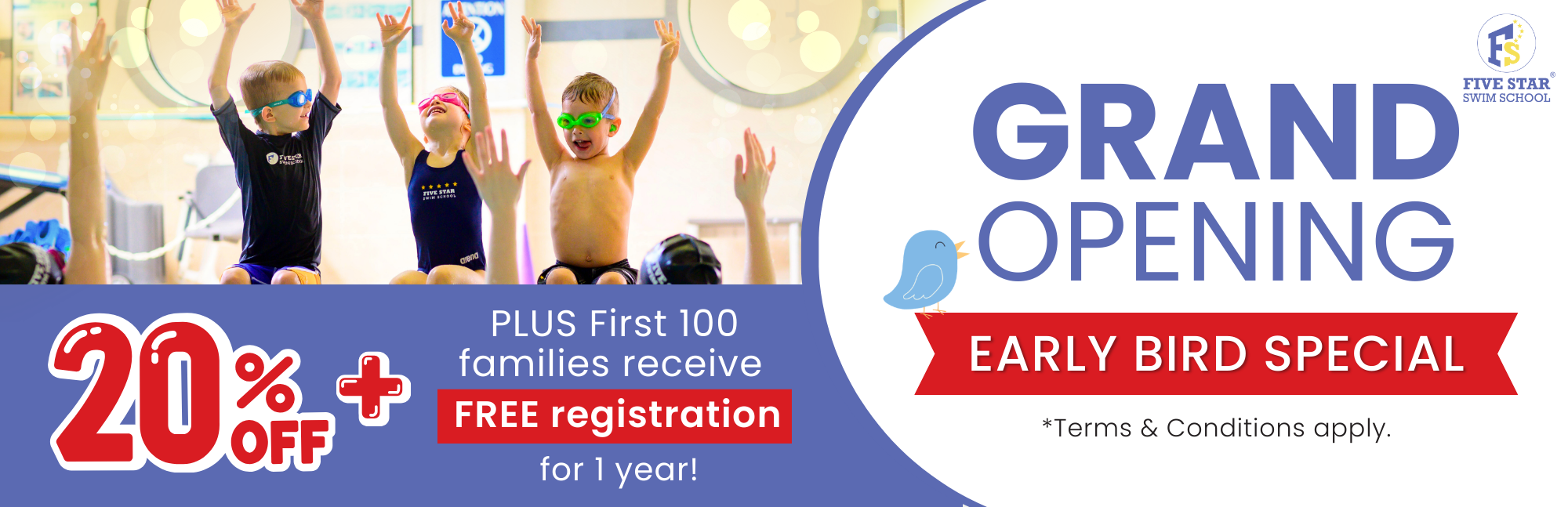 *Grand Opening Early Bird Special is available to all students who sign up for monthly classes (Basic, Plus, Ultimate Plan, or Private lessons) at Five Star Swim School – Oakland, starting from November 25, 2025. The promotion will remain valid until further notice and is subject to change. A 20% discount will be applied to the first enrollment payment at the time of enrollment.